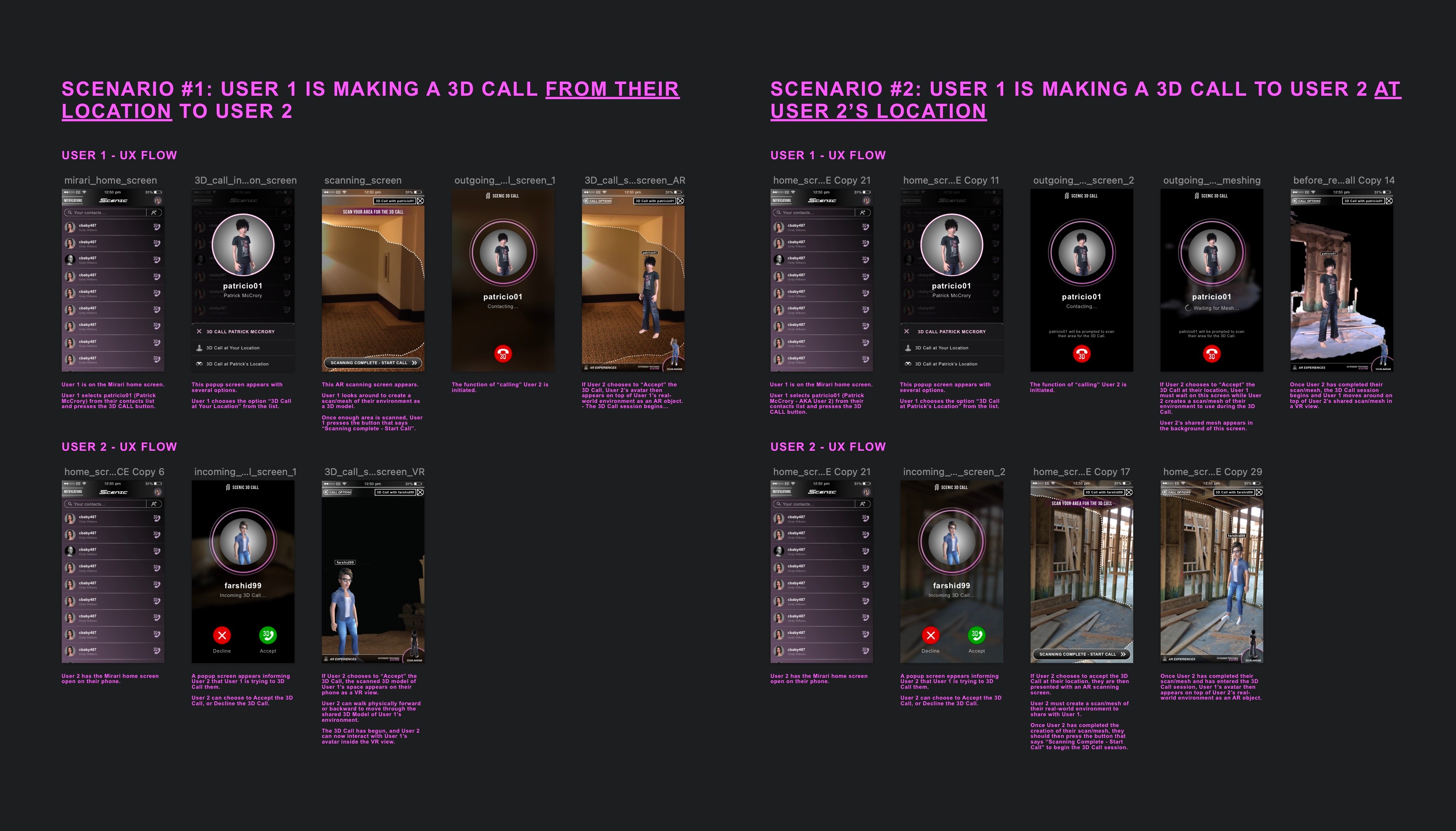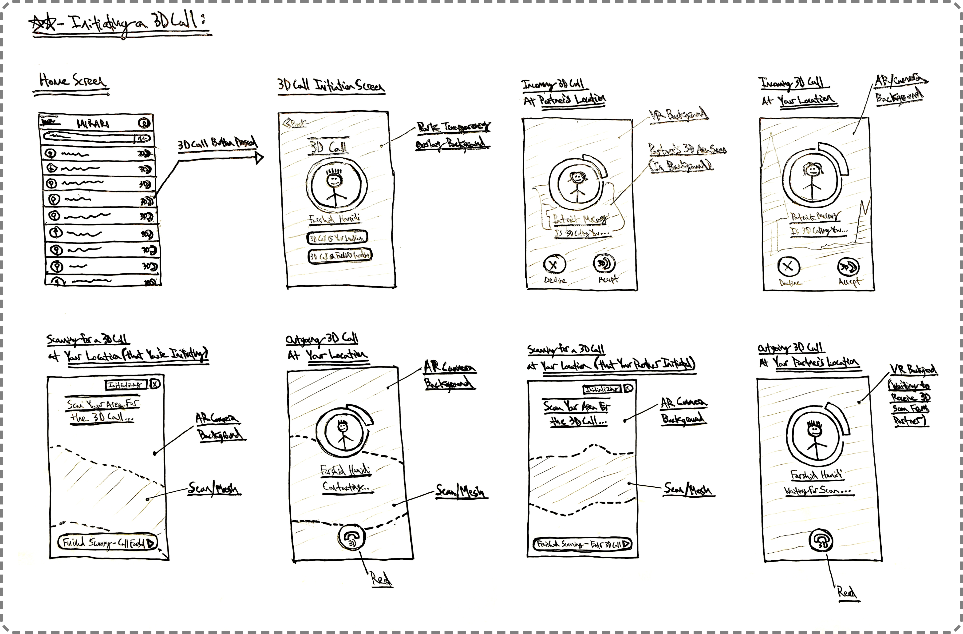 Scenic did not begin as a platform for 3D recordings. Our initial design was for a service that allowed multiple people to use an avatar to make a spatial “3D Call” to each other, allowing you to pop up in someone else’s real world space as a virtual character, and interact in real-time with them.I made a number of UI sketches & full designs for this direction for the product, a few of which are shown below. We also did a significant prototype build out and had a semi-working version of this service.Unfortunately the “real-time” nature fo this concept introduced a number of user experience issues that proved very difficult to resolve, so we moved on to the final form of Scenic, which revolved around allowing avatar creators to make 3D scene recordings in AR.