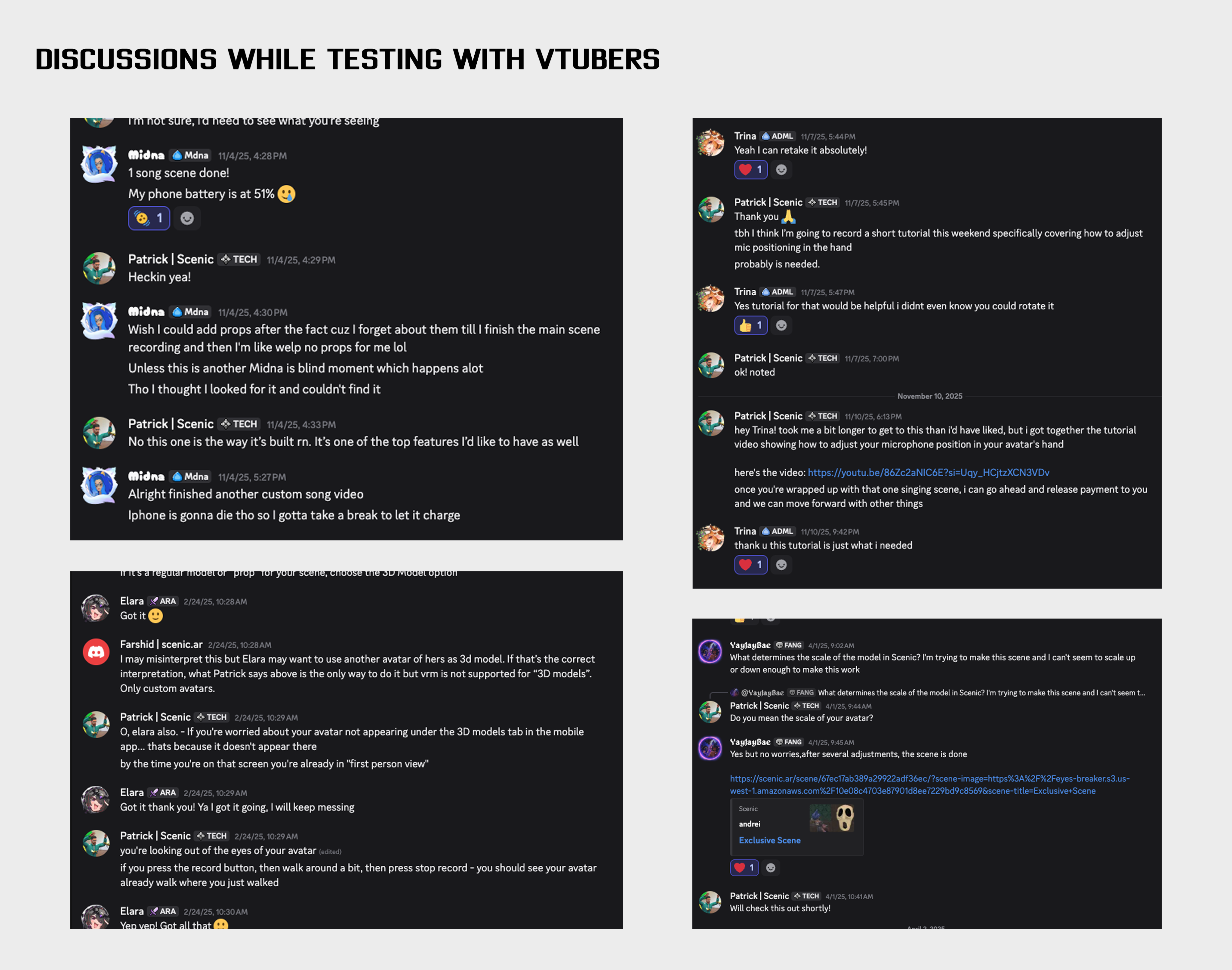 As Scenic took shape, we engaged with various VTuber to see how they actually used the service, and the issues that they had. We wanted to know how they rigged avatars, attempted to trigger animations/create scenes, how they structured performances, and distributed content - communicating with them about these features exposed gaps in our product assumptions that we needed to address.