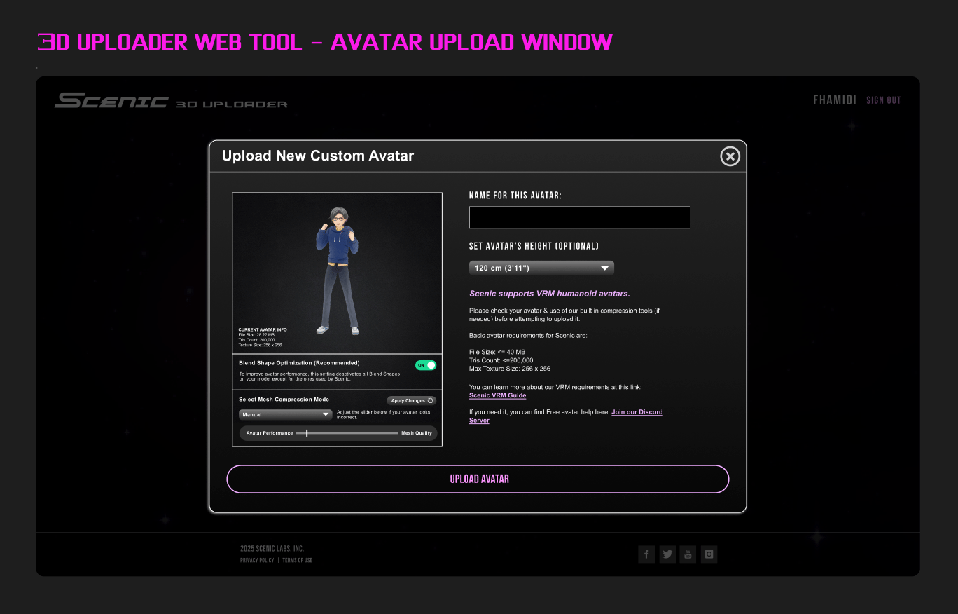 One of the more complex components of Scenic is our avatar upload pipeline. Users bring highly variable VRM and GLB avatar models, often created for desktop streaming environments with little consideration for mobile performance.