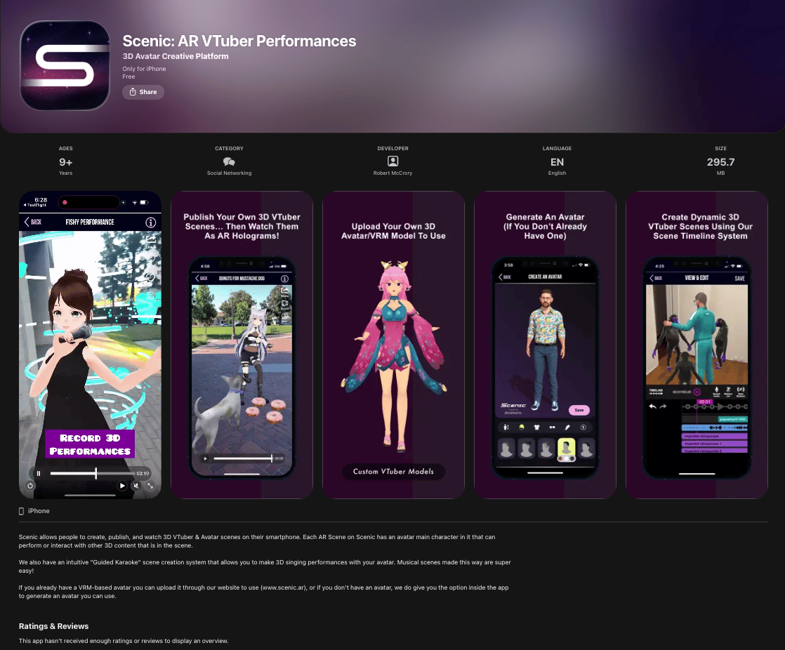 A social networking platform that allows VTubers & avatar creators to make short 3D augmented reality scenes using their virtual character. Avatar scenes published on the service can be replayed and watched in AR as unique form of 3D media, similar to personalized hologram recordings.