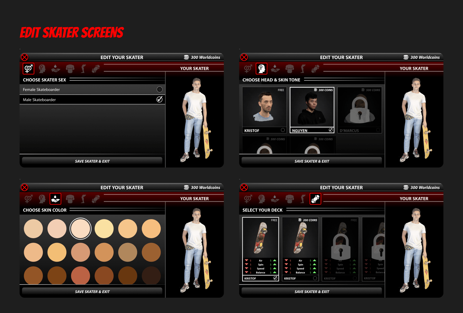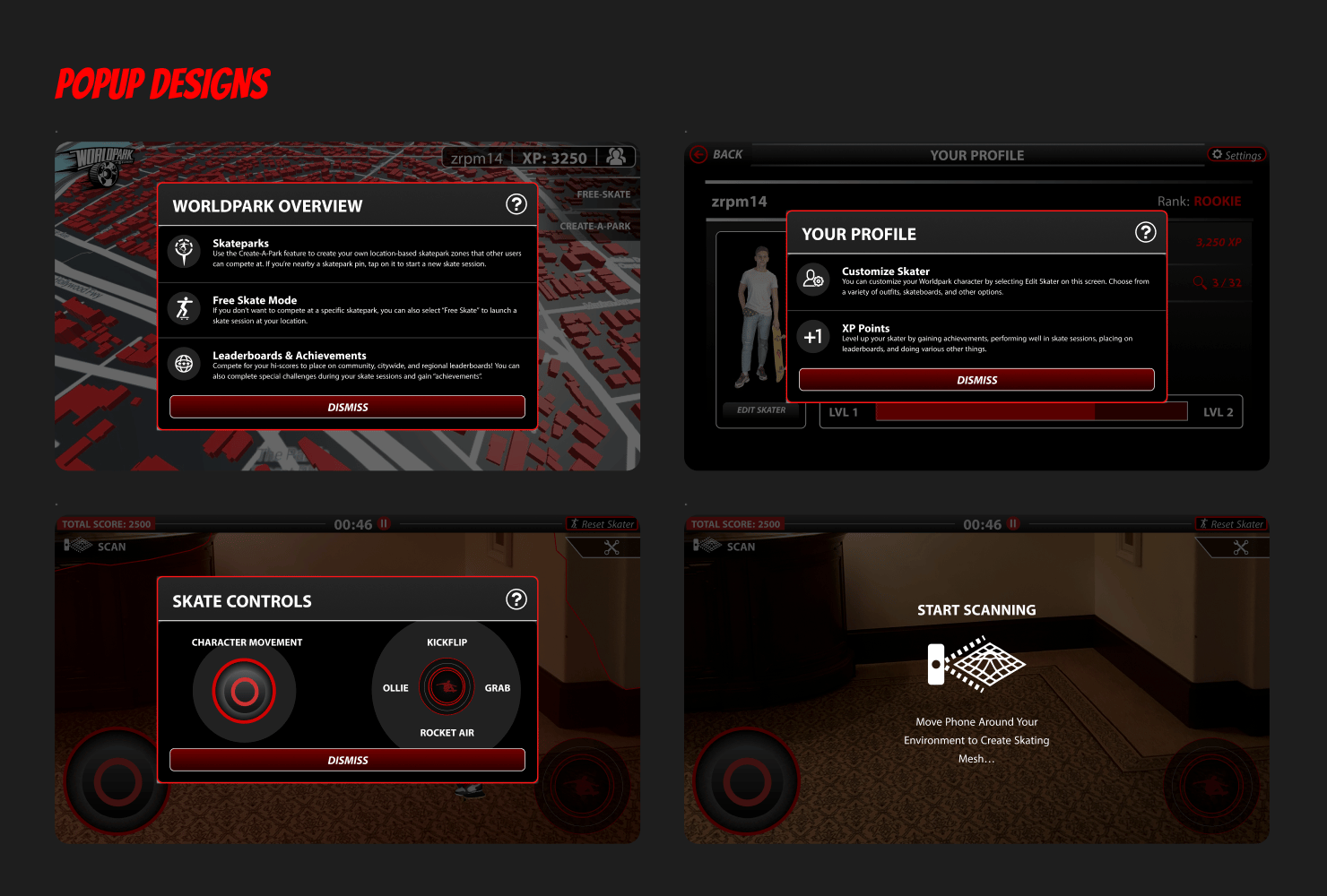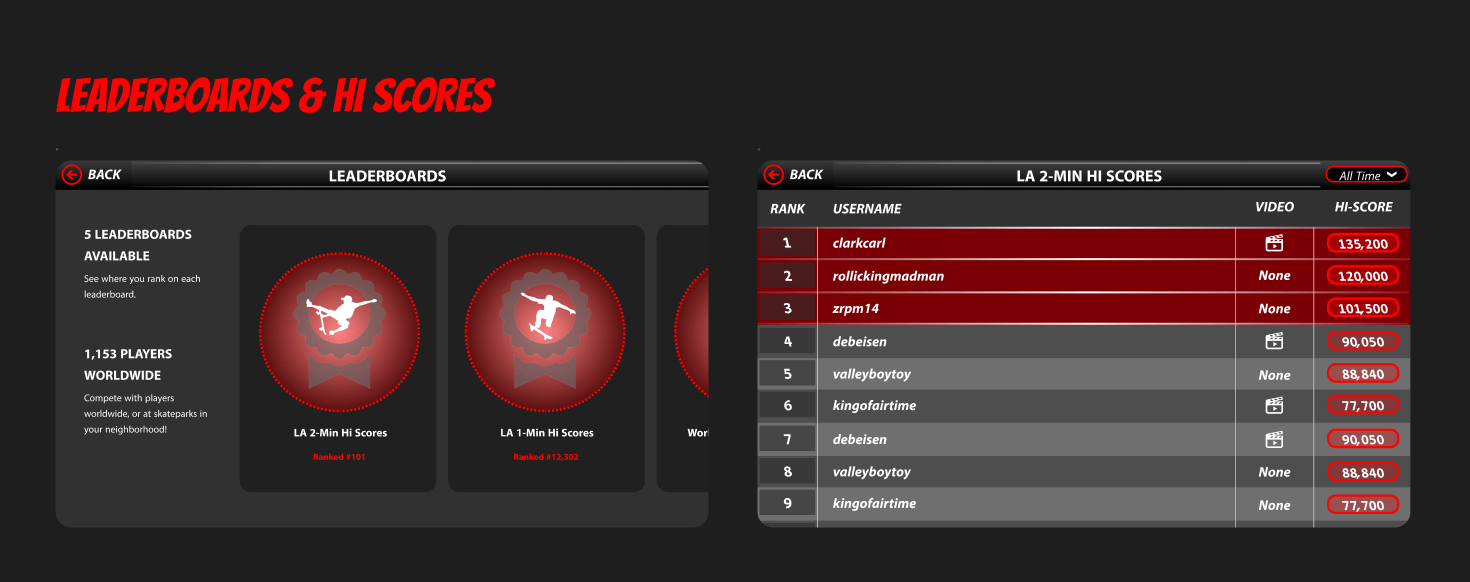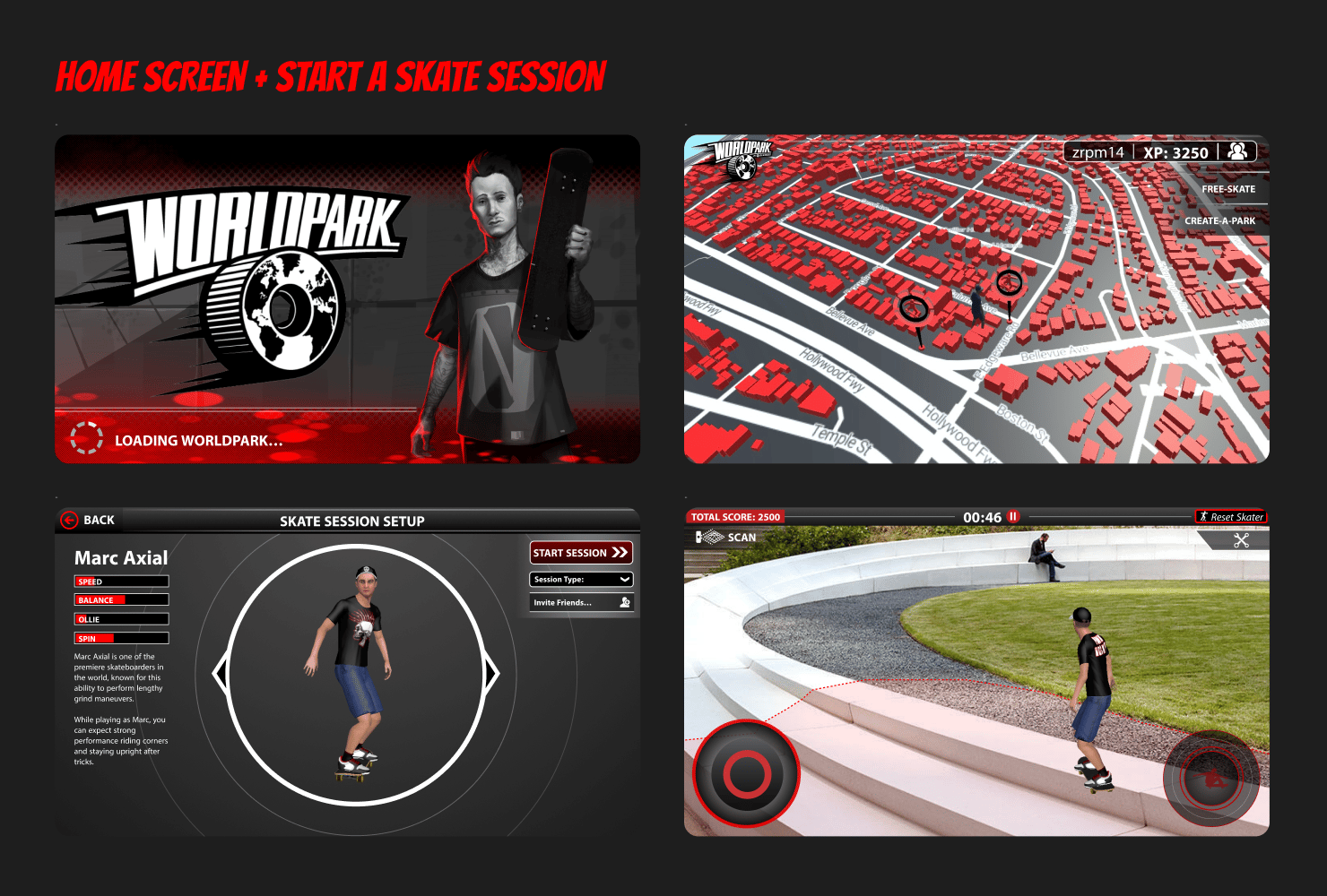The goal was not to simulate skateboarding perfectly, but to capture its core appeal — movement, creativity, and competition — in a way that worked within the constrained UI of a mobile phone.Keeping this in mind, I worked through creating the Worldpark interface. Below you can find designs for some of the key screens...