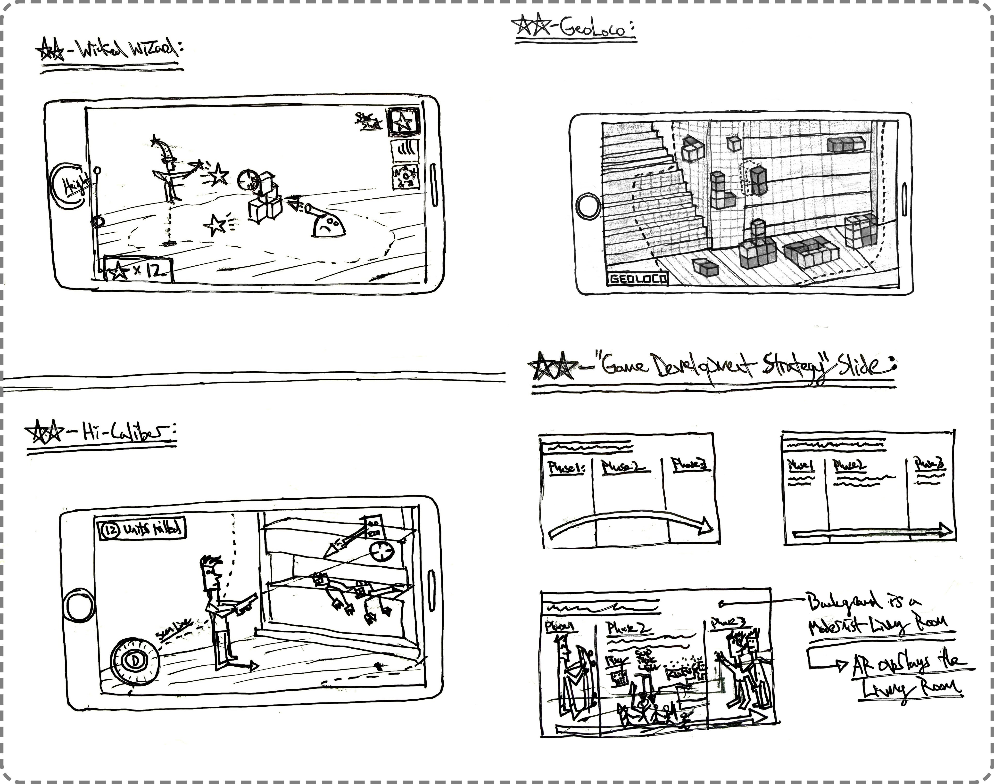 Worldpark did not begin as a skateboarding game. Early exploration focused on a wide range of AR-native game ideas that were documented with wireframes and notes.