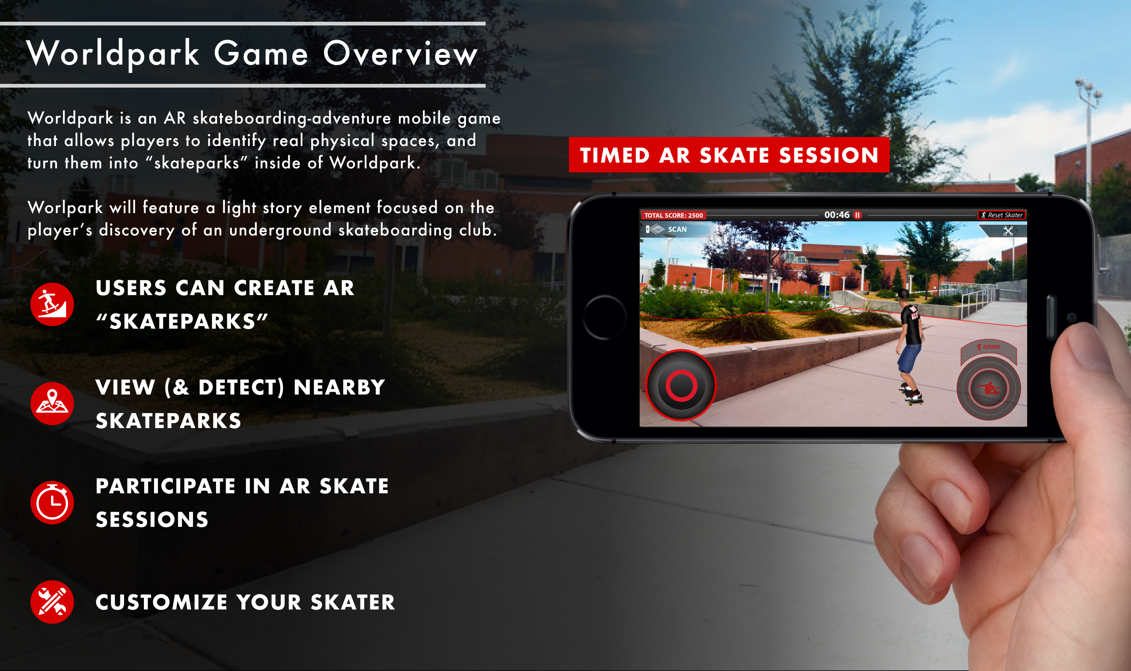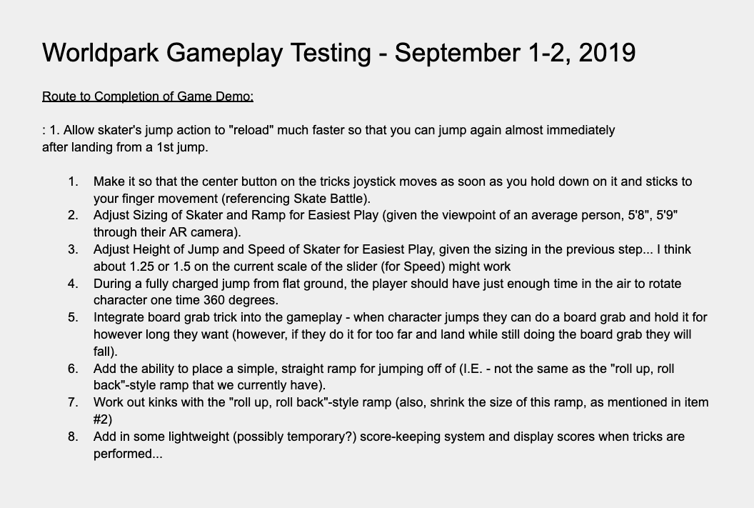 Out of this initial stage of ideating around potential AR game concepts, came the concept for Worldpark. Augmented reality and skateboarding seemed like a perfect match, since if you were to go out and go somewhere to play an AR skateboarding game somewhere, it would closely match the experience of a real skateboarder going out to find the perfect skate spot.